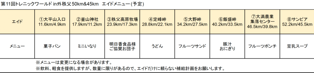 2024年11月29日tworgエイド, 協賛品 大会直前になりましたが、エイドで提供する食べ物(予定)情報を公開します。 この他にも、お菓子やフルーツ、ドリンクには、麦茶、スポドリ、コーラのほかにも豊富なジュース類を用意しています。 食べ物は、人数分を用意していますが、足らなくなる場合もあります。 エイドだけに頼らない補給計画を検討してお越しください。